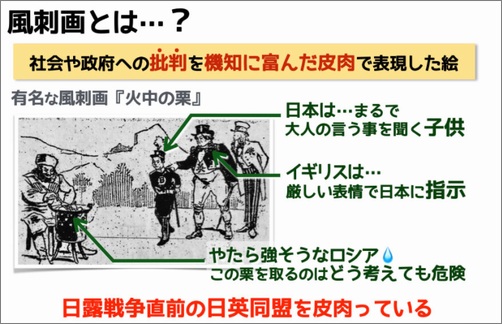 この風刺画にあるように、満州から大国ロシアを追い出し、自由貿易によって莫大な利益をあげようとする、アメリカとイギリスが、日本を使って戦わせようとした戦争です。